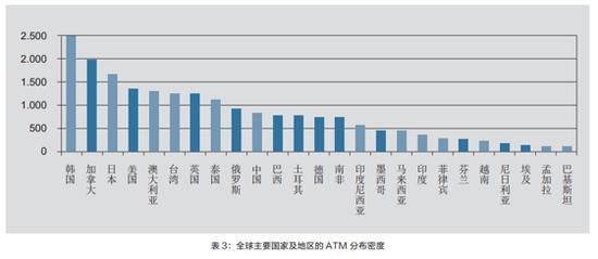 对于大多数国家来说,ATM的分布密度可能没有那么高。从表4中我们可以看出,一些处于中间水平的国家,例如中国,大概是每100万人口500台ATM的密度。