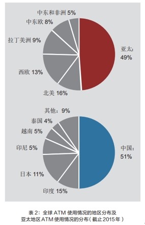 因为,16年前调研时,亚太、北美、西欧在ATM市场上所占份额是基本相当的,而现在亚太地区占有的份额已经接近一半。具体到亚太市场中的细分国家来看,中国所占比例是51%,印度占15%(如表2所示)。
