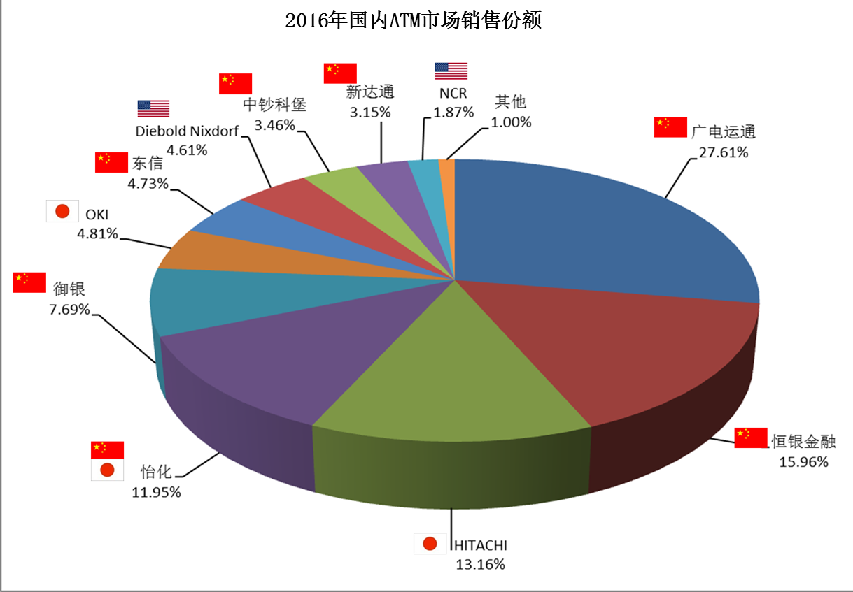 从2016年的行业统计数据来看,国产ATM厂商快速发展,市场份额不断扩大,国内市场销量排名前五的分别为广电运通、恒银金融、日立、怡化、御银。从销量排名中可以看出,广电运通继续保持国内市场领先地位,恒银金融市场份额扩大明显,已上升至第二位,日立下滑至第三位。国外品牌ATM供应商的销量和占比均在下降,颓势明显,国产品牌占据了市场主导地位。总体来看,相对于2015年,排名前五位的ATM品牌基本保持稳定。统计显示,2016年五大品牌销售量超过全年总量的75%,其中,广电运通、恒银金融等拥有核心技术的自主民族品牌厂商继续保持稳定增长,“南有广电运通,北有恒银金融”的行业发展格局愈加明显。在三大阵营的竞争格局中,国产品牌在2016年发展迅速,各家厂商(2016年怡化与OKI分家,这里把怡化归作国产品牌)已占据75%的市场份额,日系、欧美系等国外品牌市场份额仅占约25%,并有进一步下滑趋势。