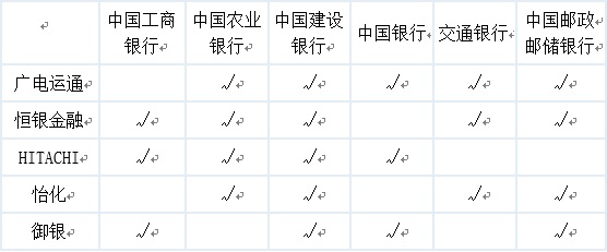 中国农业银行在行业中率先推出新型智能化设备——超级柜台。通过对传统作业流程的高度整合、前后台业务的分离控制、客户信息的实时处理,建立了“客户、网点、后台中心”三方信息实时处理的新型服务模式。据了解,农业银行已有近4万台超级柜台投入运行,农业银行超级柜台项目入围厂商前三名为恒银金融、浪潮和龙润。